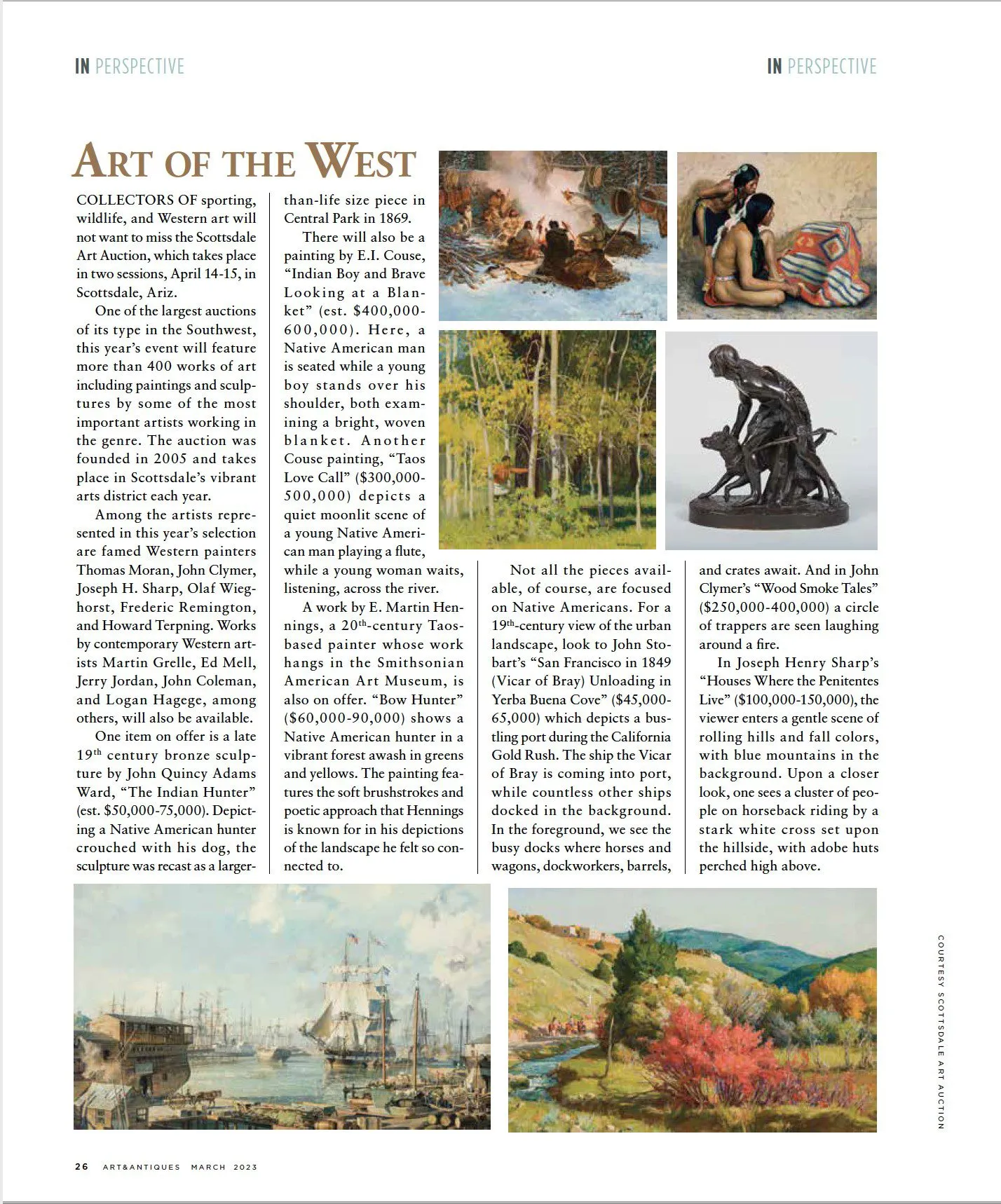 SCOTTSDALE, ARIZ. — The team at Scottsdale Art Auction (SAA), led by co-partners Brad Richardson and Michael Frost, launched the first of its two annual sales April 11-12. On the first day, works of comparatively modest value crossed the block with prices realized spanning from $585 to $152,100. The following day, the 62-lot estate collection of collector, dealer and Maynard Dixon scholar, A.P. Hays (1930-2025) kicked the day off, with the day culminating in a final 222-lot session that achieved values spanned $1,521 to $725,400.